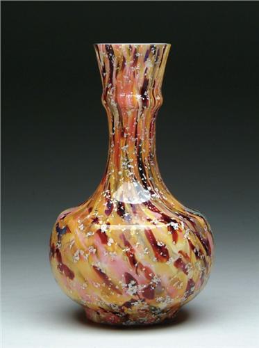 ART GLASS VASE. Spatter cased glass vase in colors of brown, pink, yellow and green with mica flecks throughout. SIZE: 9-1/2 in. t. CONDITION: Very good to excellent. 5-60738