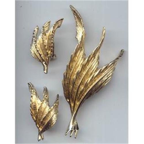<table width="100%" border="0" cellspacing="0" cellpadding="4"><tr><td><em> </em></td></tr><tr> <td width="100%"> This huge goldtone metal leaf brooch measures 3 5/8ths inches tall. It reminds me of grass moving in the wind. The pin is signed and has a good locking safety clasp on the back. The matching clip style earrings are signed as well and measure 1 1/2 inches tall. All pieces are in excellent condition. </td></tr><tr> <td> </td></tr><tr> <td>Reference #: sjartset2</td></tr><tr><td>Condition:excellent</td></tr><tr><td>Year:1960's</td></tr><tr><td>Maker:ART</td></tr><tr><td>Title:ART Golden Leaf Brooch Earrings Set</td></tr><tr><td>Location:Missoula Montana</td></tr></table>
