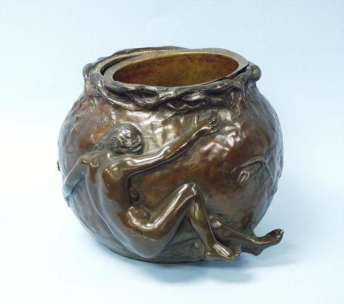 ART NOUVEAU - A. MARIONNET - An important brown patinated bronze jardiniere. Of globular form, relief sculpted with the figure of a nude beauty amongst tree branches and berries. Signed and with A. Marionnet, Paris, Foundry mark. 13" diameter, 10" high. R