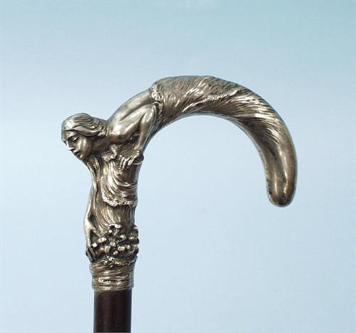 ART NOUVEAU - A mahogany wood walking stick mounted with a stylized mermaid in silver. 35" high. Circa 1900.