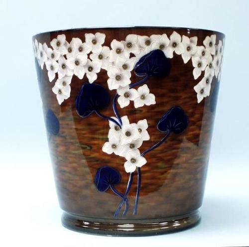 ART NOUVEAU - A pair of German faience jardinieres by Franz Melhem, Bonn. Each vessel handpainted with blue and white flowers. Top 14" dia; 14" high. Signed. Circa 1900. 3000-3500