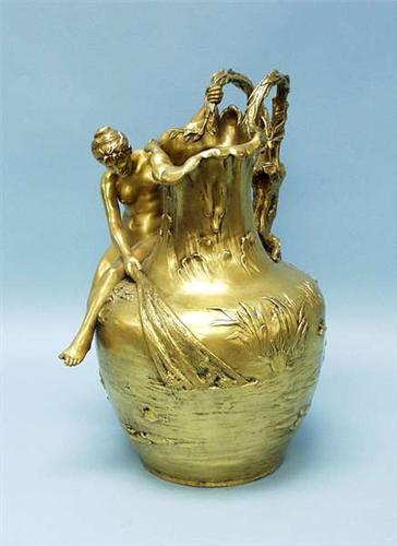 ART NOUVEAU - ALEXANDER VIBERT. An important gold patinated bronze figural jug. The baluster form vessel cast with a sitting young nude and relief cast with a naturalistic river scene along circumference. Handle in form of a windblown tree. Signed and with Siot-Decauville Foundry mark, 16 1/2" high. France, cca. 1900. Fitted with a metal liner. A museum quality offer. Ref. A. Duncan: "Art Nouveau Sculpture", and " "The Paris Salons", Volume 5, pg. 535 10000-12000