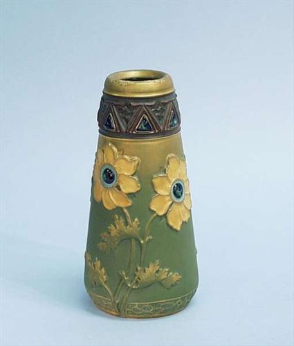ART NOUVEAU - AMPHORA, AUSTRIA. An early 20th century faience vase. The conical shaped vase relief decorated with flowers and enamelled "jewel" motives. Signed and numbered underside. 9 3/4" high. 1200-1500
