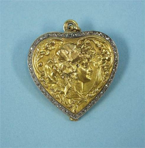 ART NOUVEAU - An important heart shaped 18 kt. yellow gold and diamond medallion. Front relief sculpted with a Mucha inspired female head surrounded by floral ornaments. Signed with initials. Circa 1900.