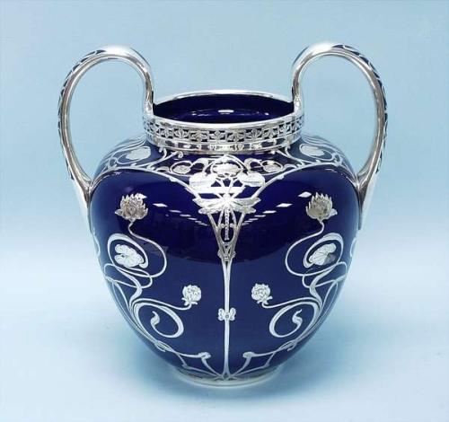 ART NOUVEAU - An unusual Austrian faience vase with extensive silver foil overlays. The baluster form vessel with a pair of applied scroll handles overlaid in pierce work silver foil with blooming flowers, tendrils and dragonflies. 13" high. Circa 1900.. 2500-3000