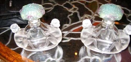 ART NOUVEAU - An unusual pair of early 20th century clear and frosted art glass figural perfume bottles. Stopper is in the form of a blooming flower. 500-600EA.