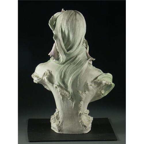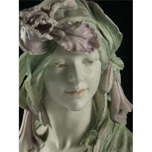 ART NOUVEAU STATUE: Possibly a bisque statue in the form of a female beauty adorned in classic Art Nouveau style, flowing hair adorned with irises which cascade into the body of the work, tinted in soft greens and light tones of violet and terminating in a low round base of the same width as the statue. On the underside there appears to have been affixed a hallmark possibly matching in size and shape to Royal Dux, numbered 506, 20' H X 14'' NOTE: Inside is a loose piece of material, some wear marks, a few minor surface chips.