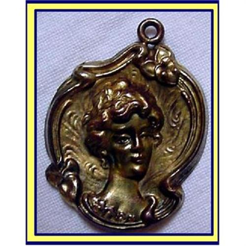 Art Nouveau silver button and brass pendant featuring a relief sculpted woman's head. French, 19th century.<BR>Pendant measures 1 1/4inch from top to bottom. Button is 1 1/8 from top to bottom.<BR>Both pieces are beautifully relief moulded in the form of a woman's head and show typical Art Nouveau assymetry. The silver button has detailed flowers around the rim. Both are in good condition.