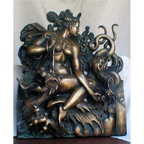 This is a rare ART NOUVEAU bronze sculptural Wall Plaque with an allegorical Goddess or mythological creature, fairy entangled with a pair of fierce writhing dragons. High relief sculpture and detail.