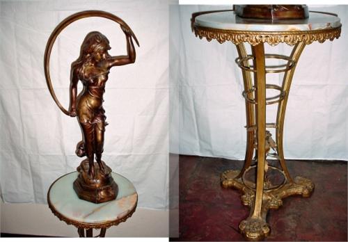 ART NOUVEAU BRONZE SCULPTURE OF A WOMAN SIGNED DIUIR DON 35" X 8" WITH STAND VICTORIAN METAL CLAW FOOTED TABLE WITH ROUND MARBLE TOP 30" X 18".
