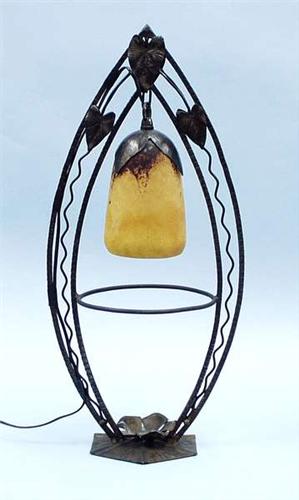 ART NOUVEAU - DAUM, NANCY. A French wrought iron table lamp with a single yellow fused art glass shade. Signed. Circa 1900. 20" high. 1800-2500