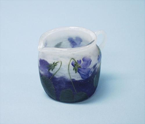 ART NOUVEAU - DAUM, NANCY. A fine etched and enamel decorated miniature cameo glass jug. Circular form with free moulded pinched rim, violet fused frosted circumference decorated with a design of delicate violet flowers and leaves. Applied handle. Signed. 3" high.