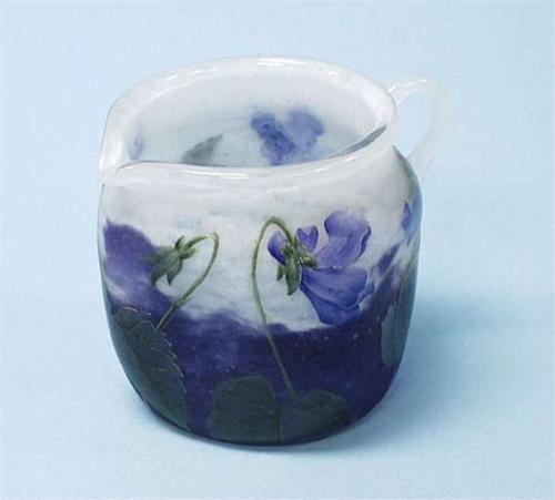 ART NOUVEAU - DAUM, NANCY. A fine etched and enamel decorated miniature cameo glass jug. Circular form with freemoulded pinched rim, violet fused frosted circumference decorated with a design of delicate violet flowers and leaves. Applied handle. Signed. 3" high. 5500-6000