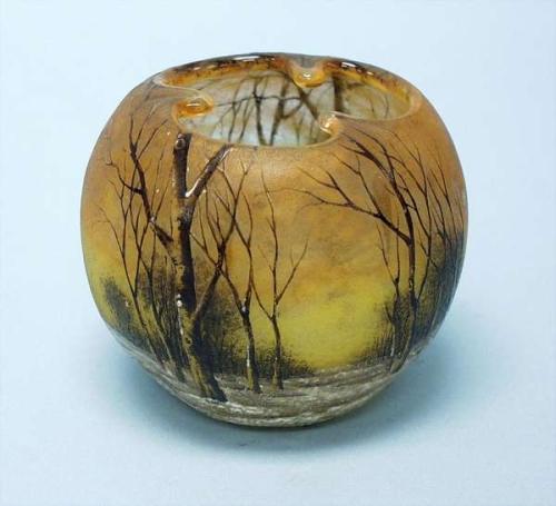 ART NOUVEAU - DAUM, NANCY - A rare " Winter Scene" decorated miniature art glass vase with handpaited and enamelled trees in a snow covered landscape. Unusual globular shape with scalloped rim. Signed. Circa 1910. 8000-10000