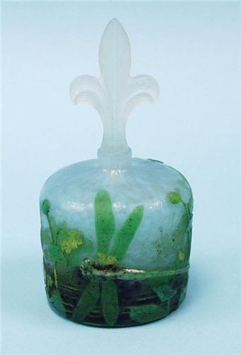 ART NOUVEAU - DAUM, NANCY. An important and unusual wheel carved and enameled perfume bottle. The columnar vessel is decorated with a large applied dragonfly and green foliage on a blue fused ground. Frosted glass stopper in the form of a finely carved Fleur-de-Lys. Signed, numbered underside. 6" high.
