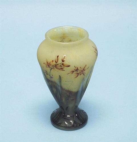 ART NOUVEAU - DAUM, NANCY. An unusual enamel decorated cameo glass cabinet vase. The four sided vessel with circular rim, enameled with colourful wild flowers. Signed. 5 1/2" high. A rare model.