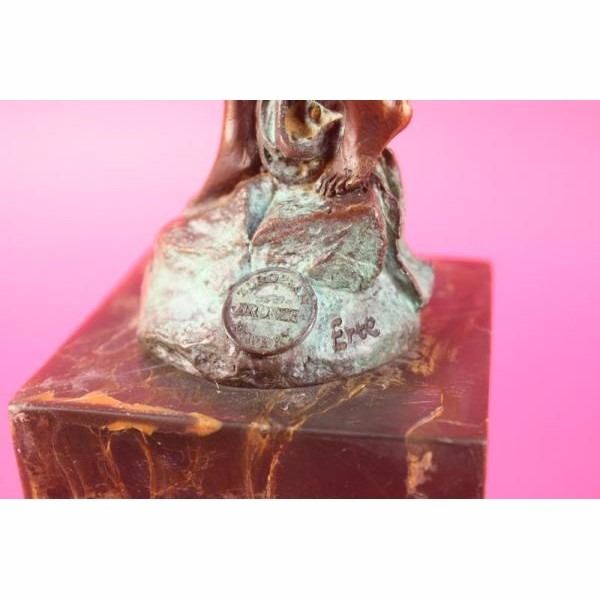 This statue is a conceptual representation of a nude girl standing upright with a cloth loosely wrapped around her. She stares straight ahead with a look of intense concentration. Her hands are covered by a cloth that encircles her head then swirls around her entire body and finally fuses with the base. This piece features a semi finished look that is highly appealing, where the finish of the bronze is created with a kind of brush stroke molded look. It is focused more on form than detail but this fact does not take away from the beauty, as seen in the way her hairline fuses with the contours of the cloth and is signed Erte. It features the lost wax method of casting, founded thousands of years ago, ensuring an exquisitely detailed sculpture that will add grace and beauty to your business or home. Condition: This sculpture is in a very Good condition. Bronze Dimensions with Marble Base:Height 14" x Width 3" Marble Dimensions: 3" x 3" Height without base: 9" Weight :7 LBS Inventory : 26-B7462862