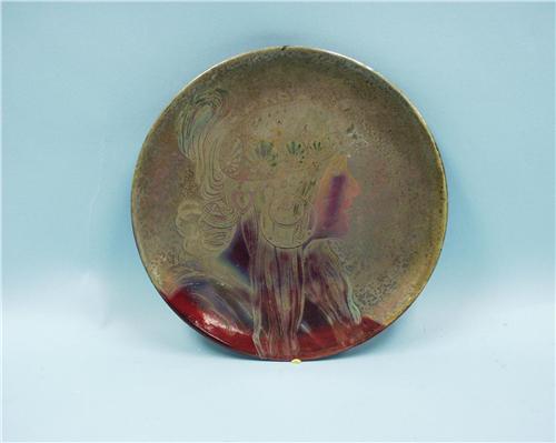 ART NOUVEAU - DELPHIN MASSIER. A fine lustre glazed faience wall plate. Hand painted with the portrait of a woman. Signed on reverse. French circa 1900. Approx 9" diameter. A similar model illustrated in Massier, Catalogue Raisonne, page 28.