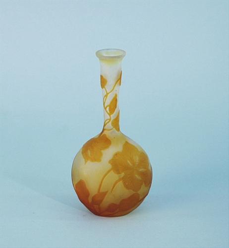 ART NOUVEAU - EMILE GALLE. A cabinet size French cameo glass vase. The circular body with elongated neck and fused opaline ground overlaid in brown and yellow with flowers and leaves. 6 1/2" high.
