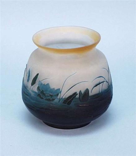 ART NOUVEAU - EMILE GALLE. A fine French cameo glass vase. The oviform opaline body with raised neck, decorated in cameo with green and blue water lilies. Signed. 5" high. 3500-4000