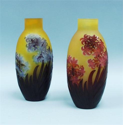 ART NOUVEAU - EMILE GALLE. A rare pair of mould blown and cameo decorated art glass vases. One red, the other with blue hyacinth flowers and leaves on fused ochre ground. Each with cameo signature. 12" high. Circa 1900. Illustrated in A. Duncan - G. De Bartha: "Glass by Galle", page 197, ill. 300.