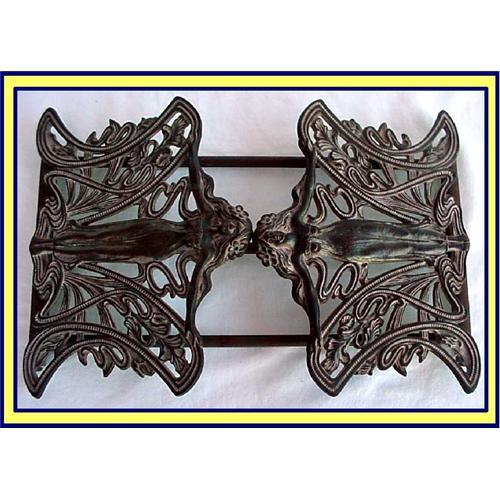 Art Nouveau figural brass extending telescoping book stand / rack. 19th century.<BR>Original Art Nouveau book rack with openwork moulded women amidst butterfly - like foliage.<BR> Folds up, extends and telescopes from 11 1/2inches to 23 1/4 inches when fully extended.<BR>Impressed 8786 on the back of each side.<BR>Classic Nouveau with elongated figures of women with outstretched arms, flowers in their long, <BR>flowing locks. Whiplash snaking openwork encloses foliage detail. <BR>Good original condition.