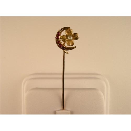 THIS ANTIQUE ART NOUVEAU STICKPIN IS CIRCA 1900 AND IT IS IN EXCELLENT CONDITION! This Antique 14k Gold Stickpin is done in the 'HONEYMOON STYLE'. There are lovely Cabochon Garnets set in the Quarter Moon and an etched Dogwood seats a beautiful White Pearl. The 'honeymoon style' was popular for bridges to give as a Wedding Presents at the turn of the century. This Antique Gold Stickpin is a wonderful piece of romance AND it is in Excellent condition!
