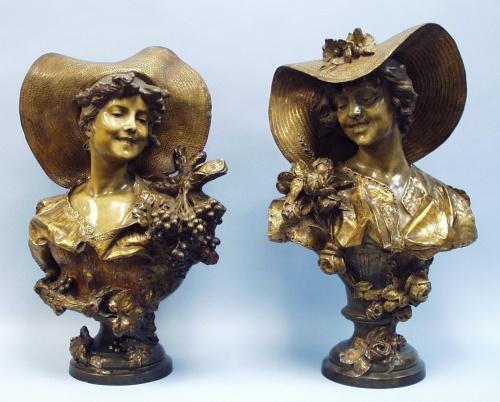 ART NOUVEAU - GOLDSCHEIDER & LOCCATELLI - A magnificent pair of terra cotta busts of two ladies in Belle Epoque costume, with fine detail and good patina. Signed and impressed Goldscheider. Made in Austria. 30 1/2" high. Circa 1900.