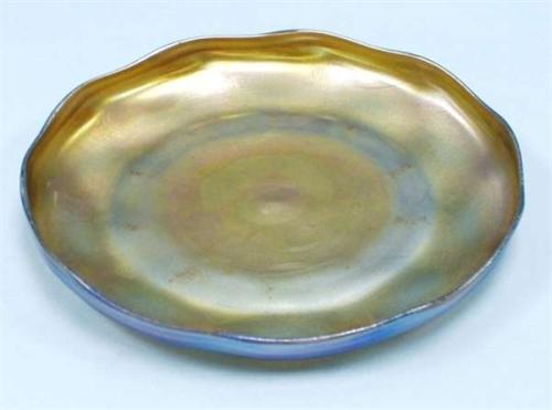 ART NOUVEAU - L.C. Tiffany - An iridescent Favrile art glass circular tray. Signed L.C.T and numbered. Circa 1900. 9" diam. 1800-2500