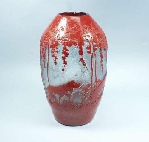 ART NOUVEAU - LEGRAS. A good French acid carved cameo glass vase. Overlaid in burgundy with hounds and fox in a forest setting. Signed. 8 3/4" high. Circa 1900. 2500-3000