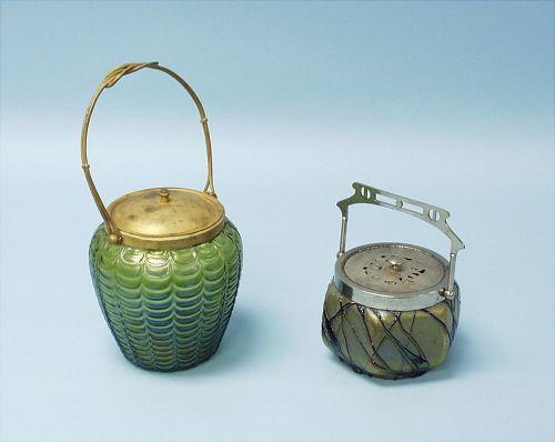 ART NOUVEAU - LOETZ. A lot of two metal mounted iridescent glass cookie jars, one with a fish scale decoration and the other with relief ripple design. Silver patinated mounts. Austrian, circa 1900.