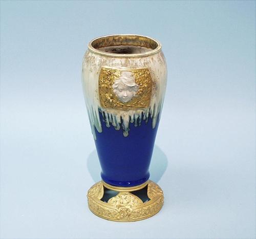 ART NOUVEAU - LOUCHET, PARIS. A fine French symbolist bronze mounted porcelain vase. The oviform vessel with blue and beige ground decorated with a pair of cameo female heads in a gilt floral field. Mounted on pierce work bronze base. Hallmarked with circular stamp and signed underside. ALP. F.L. 9 1/2" high.