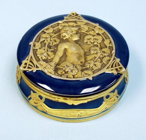 ART NOUVEAU - LOUCHET, PARIS. A good French porcelain covered box, with gilt bronze mountings. The circular box is with blue ground, relief decorated with figural and floral scenes. Marked on gilt signature plaque. 6" dia, 2" high. Circa 1900.