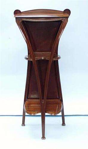 ART NOUVEAU - LOUIS MAJORELLE. A pair of fine French mahogany display pedestals. Fitted with two heart shaped shelves and galleried rectangular top. 21" wide, 10 1/2" deep, 49" high. A similar model illustrated in A. Duncan: "Louis Majorelle, Master of Art Nouveau", illustration 64. Circa 1900. 13000-15000
