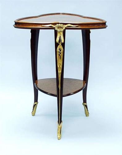 ART NOUVEAU - LOUIS MAJORELLE. A two tier tripod table in mahogany and burled maple with gilt bronze mounted triangular top. 31" high, 21" long. French, circa 1900. Ref. "Louis Majorelle, Master of Art Nouveau Design" by A. Duncan. page 102. 13000-15000