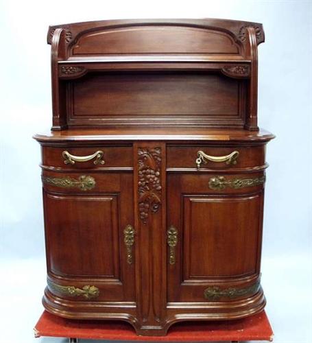 ART NOUVEAU - LOUIS MAJORELLE. "La Vigne". A fine French mahogany cabinet with bronze mountings. The rectangular fronted cupboard with two shelves, doors separated by a carved central support. Frieze with two drawers. Period mounts. 48" wide, 21" deep, 61" high. A similar model illustrated in Majorelle - Nancy Catalogue, Salle a Manger "La Vigne". 18000-20000
