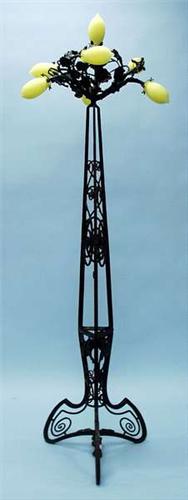 ART NOUVEAU - Muller, Freres. An important French wrought iron floor lamp. Arms fitted with 7 acid finished art glass shades in the form of lemon fruits. A rare model. Circa 1900. 75" high. Dedicated to M. Bordes, 1926. 18000-25000