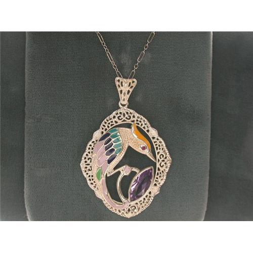 This Art Nouveau style necklace is an Authentic & Accurate copy of a necklace from Circa 1900 - and - THIS one is in Mint condition. The necklace is all Sterling Silver and it features a Marquise Cut Genuine Amethyst = 8 Carats with an enamelled bird to aside surrounded by outstanding filigree work. The pendant measures 1 3/4" x 1 1/4" and the chain is 16" in length.
