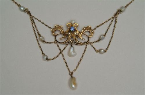 ART NOUVEAU NECKLACE. Fantastic 14kt yellow gold necklace features free flowing Art Nouveau design with fresh water pearls, seed pearls and a center blue sapphire. All suspended within overlapping 14kt gold chains. CONDITION: Very good to excellent. 5-61209
