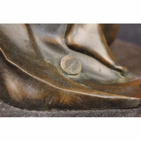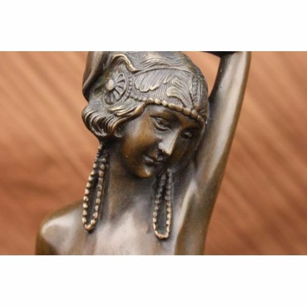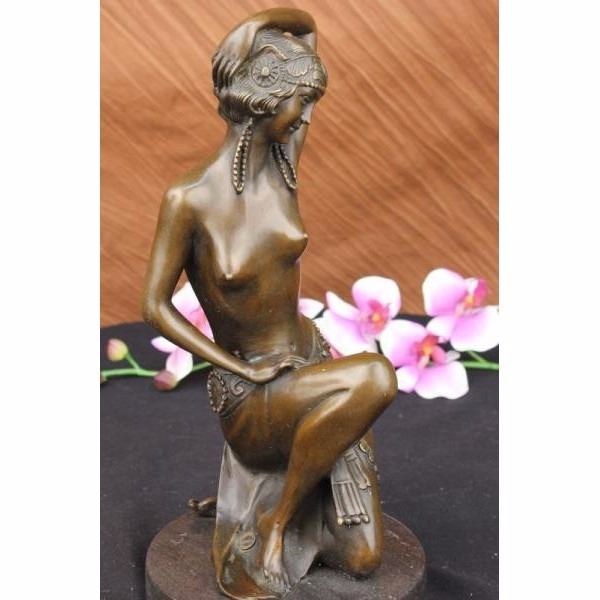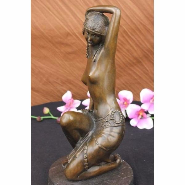 The nude beauty, adorned with only a translucent beaded skirt and head piece, kneels on her left knee in an alluring pose. Her left hand bends and crowns her head that faces down. The 100% bronze sculpture was cast using the ancient method of lost-wax casting and stained with a brown patina finish for perpetuation. She is mounted upon a black marble base with the artist Milo's signature. The artist Milo lived most of his childhood in Andalusia, Spain. Influenced by an artistic family background, he began sculpting at the age of seventeen. After apprenticing with several accomplished sculptors both in America and Spain, he began his own work focusing equally on steel and bronze. Condition: This sculpture is in perfect condition. Bronze Dimensions with Marble Base:Height 13" x Width 6" Marble Dimensions: Diameter 6". Height without base: 12" Weight : 10 LBS Inventory :65Y2033556