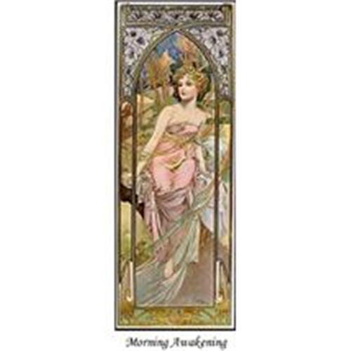 Original Art Nouveau poster "Morning Awakening" was created in 1899 as a part of the series "The Times of the Day". This full size over 20 years old "Out of Print" reproduction poster is in MINT condition, ornamental arch decor is applied with gold by Silkscreen process. Mucha signature in lower right corner. Translation of the Czech text in the margin : Printed in 1981 by Javoz Jablonec n N in the edition of 3000. Author A. Mucha from the series The Times of the Day. Size : 870 x 324 mm (appx. 12 3/4 x 34 1/4"). Printed in Czechoslovakia. Please NOTE: THIS IS LARGE FULL SIZE poster - not "oversize POSTCARD" print!!!!! The name of the pictured poster in the white margin is not part of the actual poster
