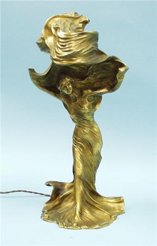 ART NOUVEAU - RAOUL FRANCOIS LARCHE (1860-1912) French school. "Loie Fuller". A gilt bronze table lamp. Signed. With Siot Decaville foundry mark. 17" high. Ref. Benezit vol. 5, page 412. Illustrated in A. Duncan "Art Nouveau Sculpture", page 44.