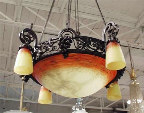 ART NOUVEAU - SCHNEIDER, FRANCE. An important wrought iron and art glass chandelier. The basket form frame decorated with scrolls and grapes. Mounted with a central circular art glass shade and four tulip form side pendants each yellow and burnt orange fused art glass. Central shade approx. 20" diameter, 43" long. Signed. 7000-9000
