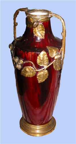 ART NOUVEAU - SEVRES, France. A gilt bronze mounted red flambe glazed vase with leaf decorations. Underglaze hallmark. Approx. 11" high. Circa 1900.