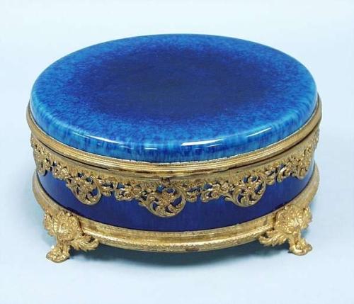 ART NOUVEAU - SEVRES, France - A turquoise glazed circular porcelain box with gilt bronze mounts. 8 1/2" diameter. Fully marked. Circa 1900. 800-1200
