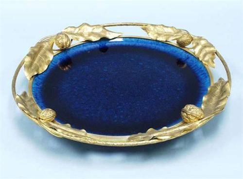ART NOUVEAU - SEVRES, France. A turquoise glazed circular tray with gilt bronze leaf decoration. Fully marked. Circa 1900. 14" diameter. 1500-1800