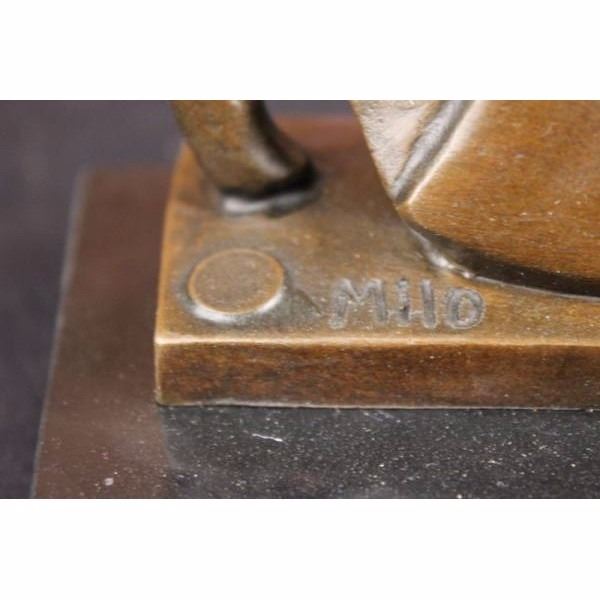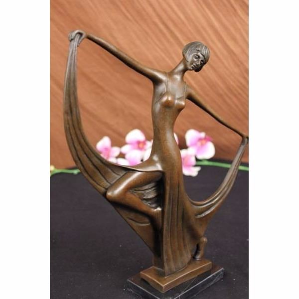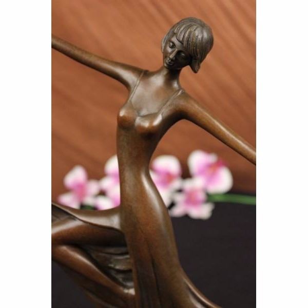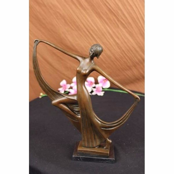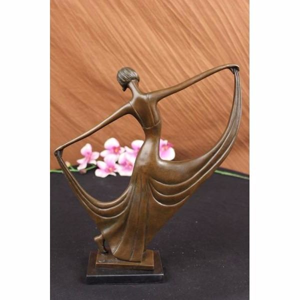 The lean and elegant figurine is captured in mid-dance. Her2-dimensional appearance seems as though she was removed from a wallcarving creating an interesting abstract illusion. She fans out thegarments of her ankle-length dress amplifying the motion of herdance.Her right knee bends peaking out of the slit in her dress. Shecloses her eyes with the emotion of her dance as she serenely smiles.The dancer was cast using the age-old technique of lost-waxcasting. She is stained in a brown patina and mounted upon a blackmarble base with the artist Milo's signature. Condition: This sculpture is in perfect condition. Bronze Dimensions with Marble Base:Height 13" x Width 12" Marble Dimensions: 5" X 3" Height without base: 12 1/2" Weight : 8 LBS Inventory: 41DS3254541