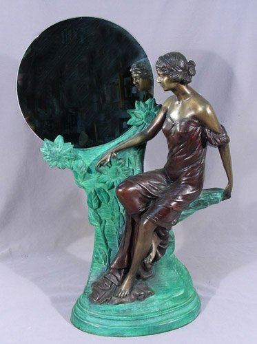 A heavy bronze sculpture of beautiful woman sitting on a branch and staring into a beveled glass mirror. Three color patina. 24" high.