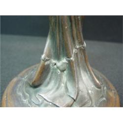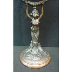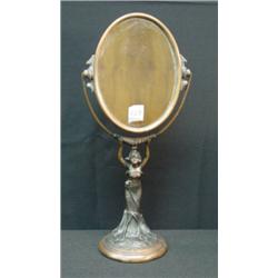 Art Nouveau style dresser mirror with adjustable oval mirror on stand. Painted in a copper and dark metal paint, figure of woman forms the holder. It has old repairs to base where it has been soldered back together but very functional. Buying AS IS.