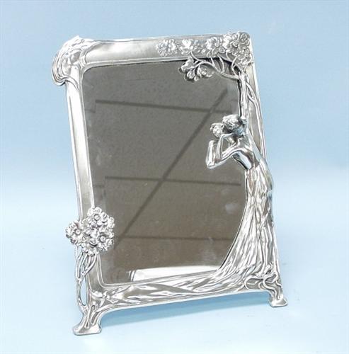 ART NOUVEAU - WMF. A fine figural easel mirror. The rectangular silver patinated frame relief decorated with a young beauty amongst foliage. 14 1/2" x 11". Hallmarked and with retailer's stamp. Same model illustrated in "WMF - Art Nouveau Domestic Metalwork" page 295, #131.